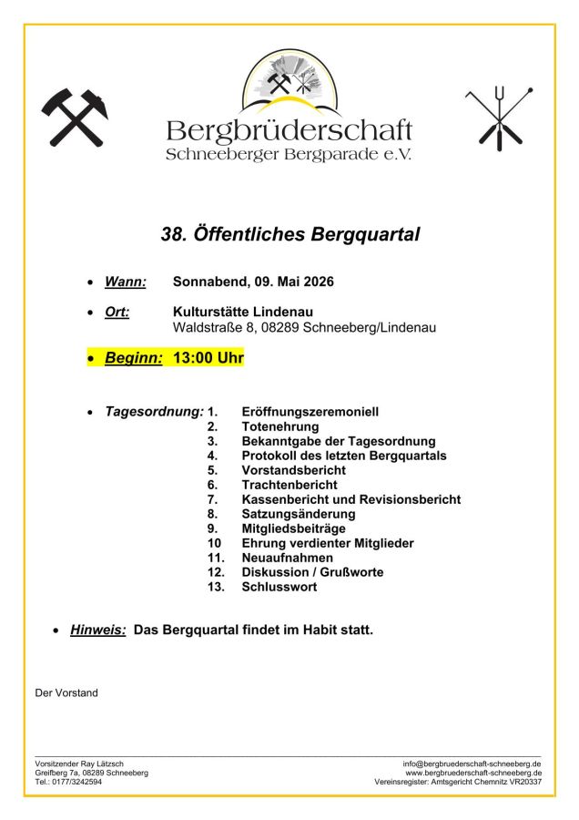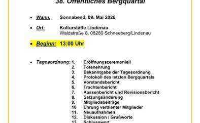 Am 09. Mai um 13:00 Uhr begeht die Bergbrüderschaft „Schneeberger Bergparade“ e. V. ihr 38. öffentliches Bergquartal. Das Bergquartal, die Jahreshauptversammlung der Bergbrüderschaft Schneeberg findet in der Kulturstätte Lindenau statt. Dieses Jahr kann der Verein auf 59 Jahre Vereinstätigkeit seit der Wiedergründung am 12. Mai 1967 zurückblicken.